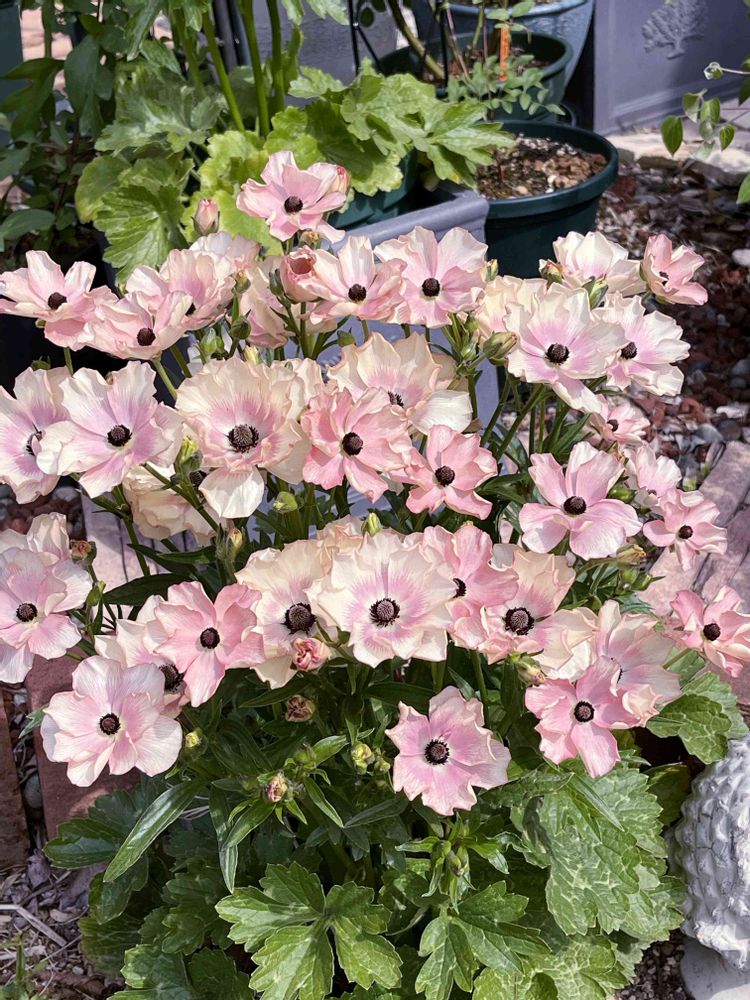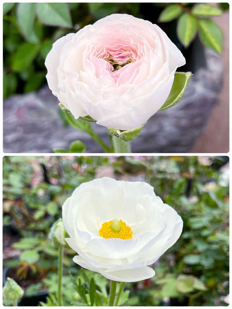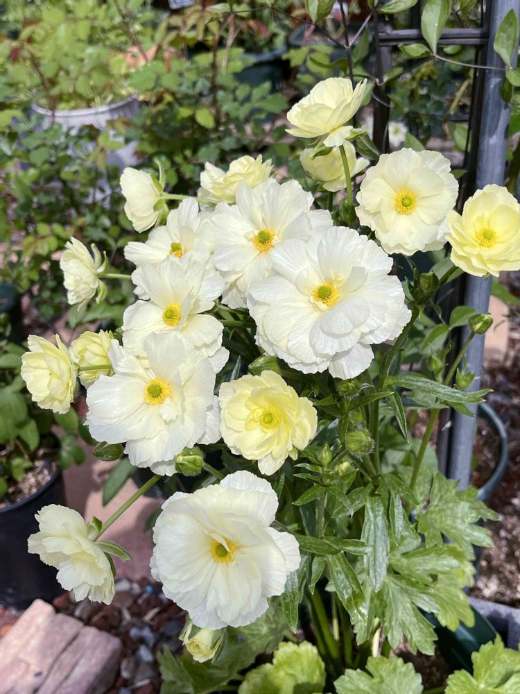 3年目?の生協で購入した白いラナンキュラスと去年寄せ植えにしていたウピスも無事に開花🤍