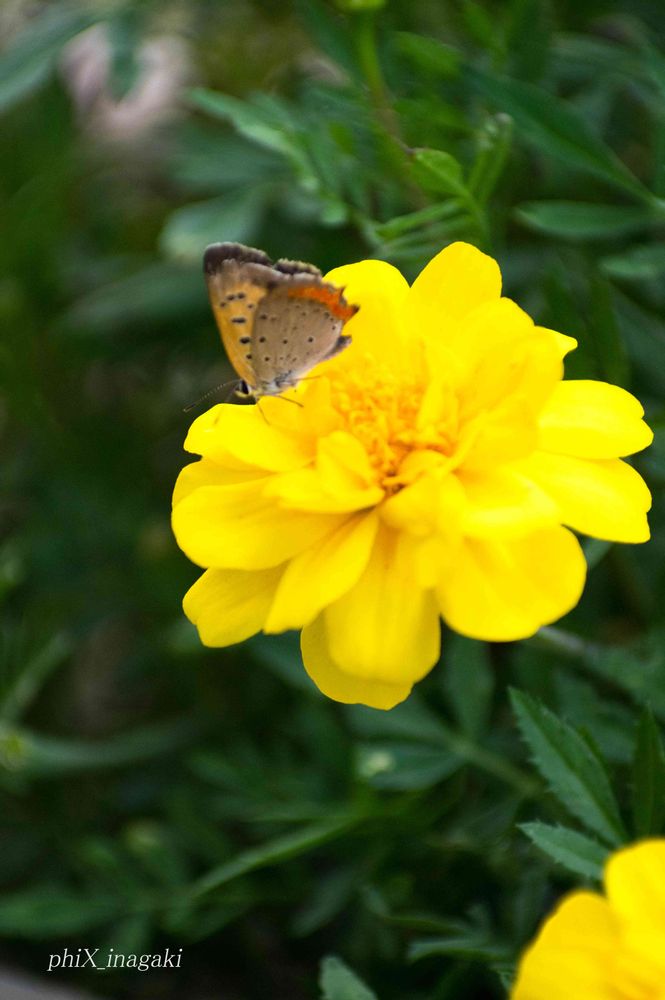 黄色いマリーゴールドとベニシジミ