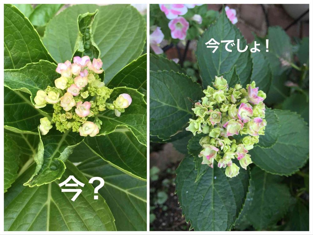左: 昨年強剪定して、今年は花芽が付かなかった紫陽花鉢から、今になってひとつだけ咲こうとしているモノがいます🤨