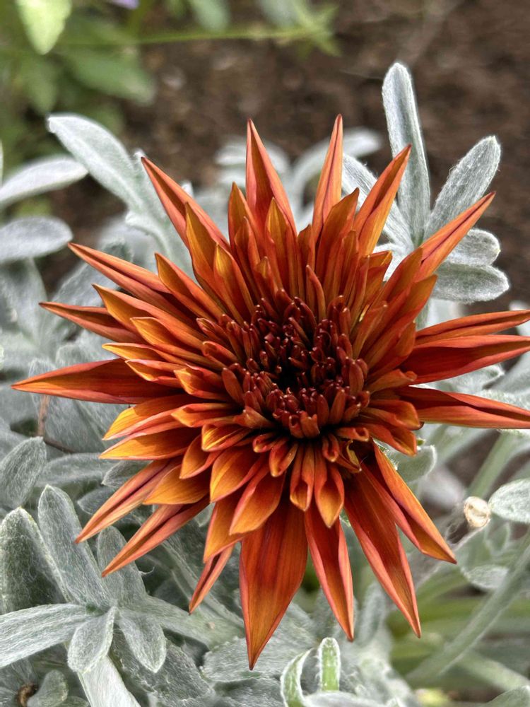 銀葉と八重咲きの赤橙色が渋いですね〜💞
