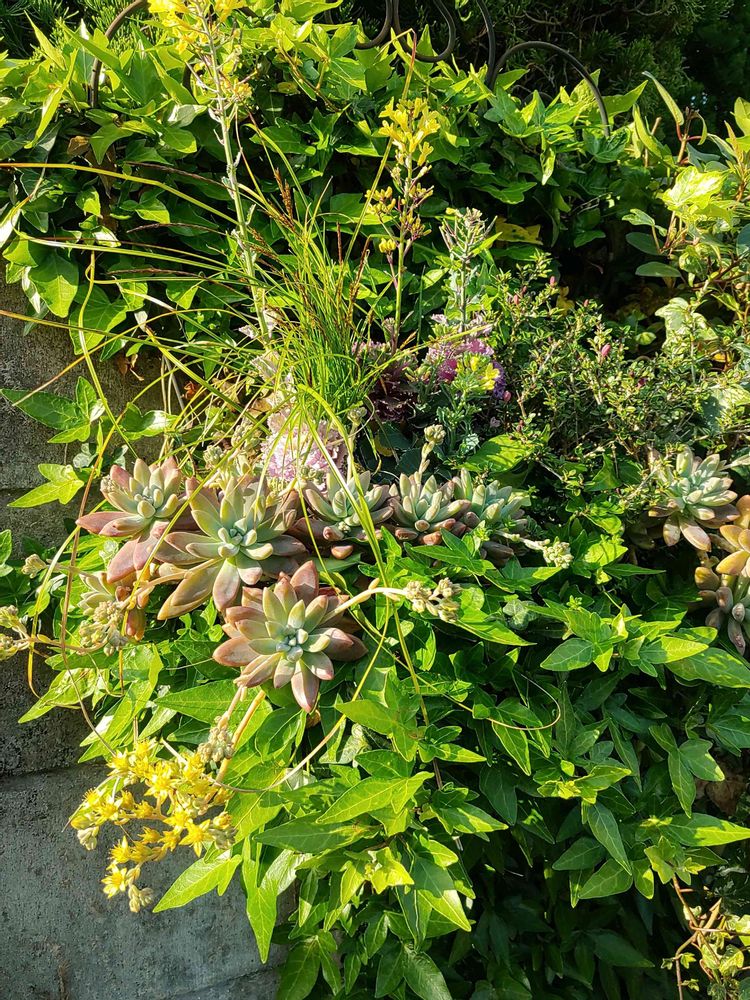 アイビーまみれのブロック塀に引っ掛けておくと アイビーが成長してプラスチックの鉢を隠してくれて、塀から草花が生えてるように見えるんです😊😊