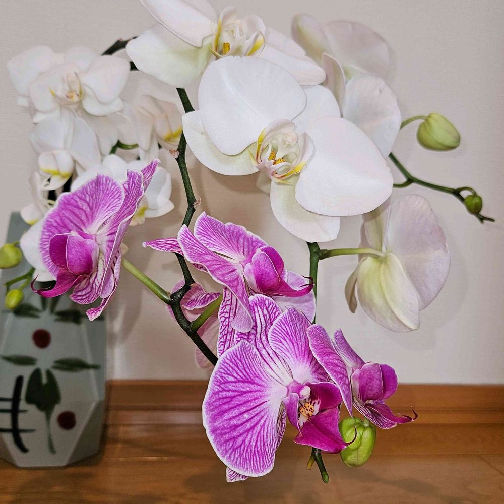 白の大きなコチョウラン2本と左に見えないかな🤭小さいコチョウランがあります「え~ちゃん」蕾だけ見えるかな😂写真間違えたなぁ💧←最初の方の子です。