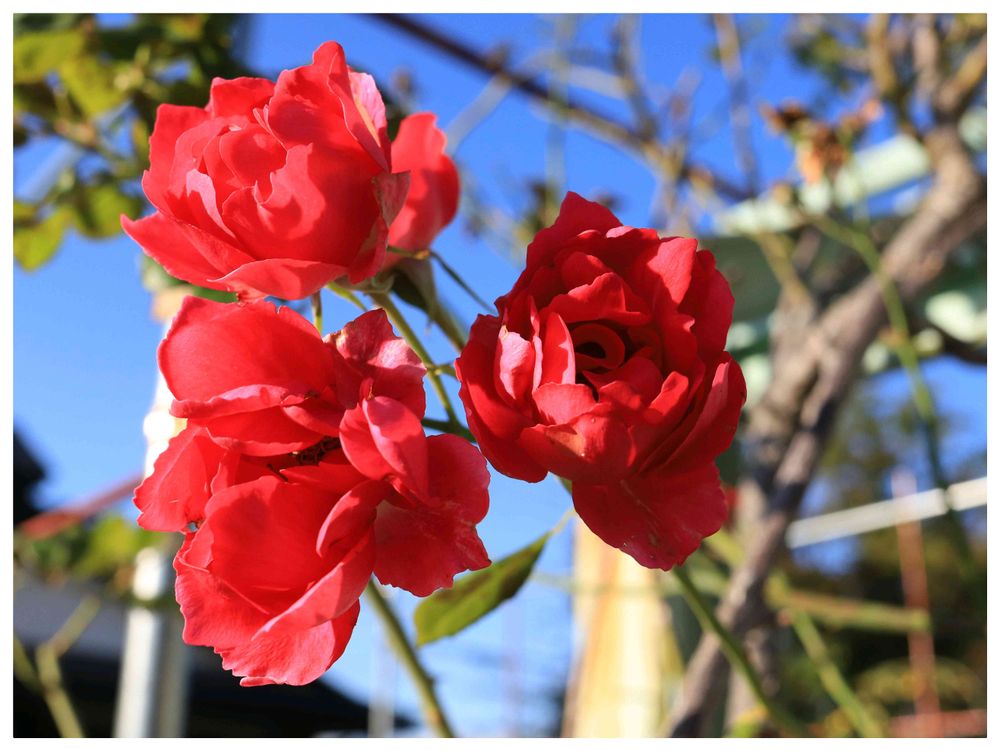 澄んだ空から照らして赤いバラ🌹の輝きが見応えますね🌹✨✨✨♡