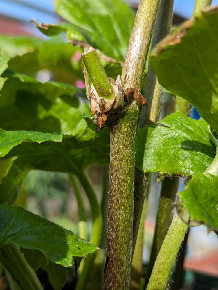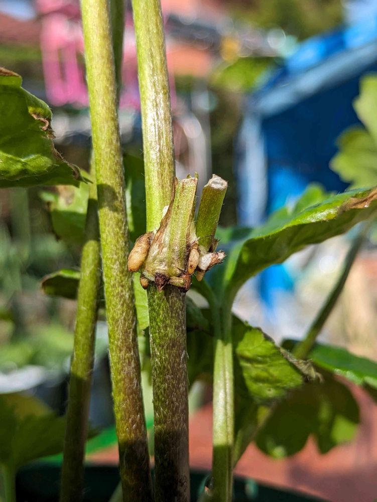 ④⑤こちらはジュピター。花が終わり葉っぱと一部残った茎になんか塊が……これってまさかの球根???