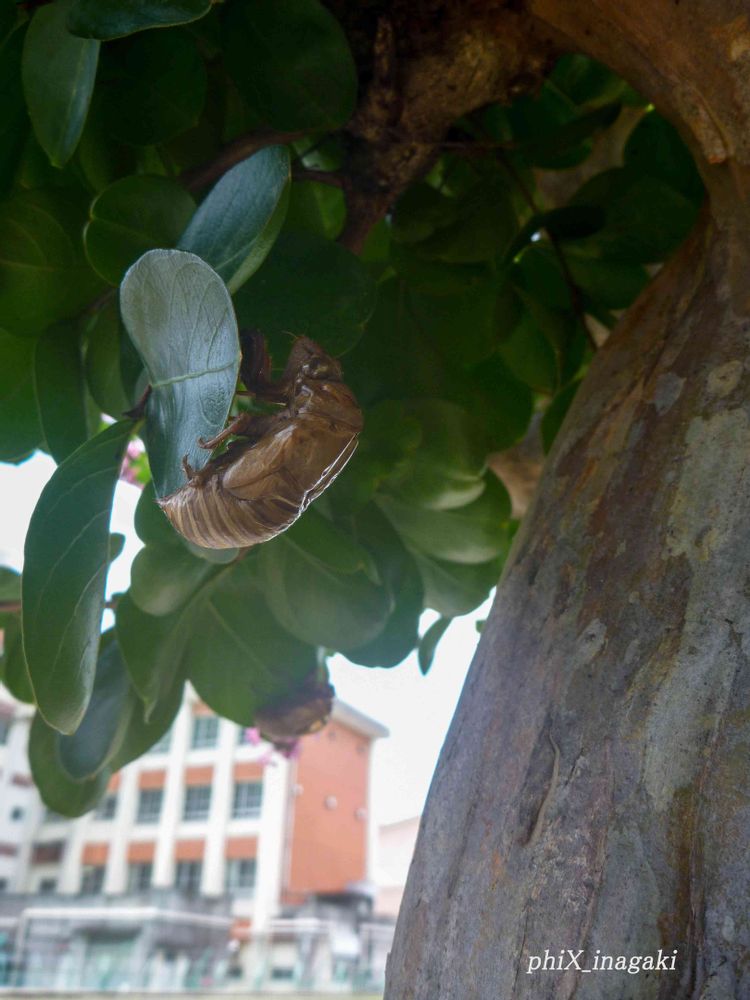 訪問先の街の中学校前は百日紅が街路樹に植わっています。ツルツルの木の幹を見ていたら、大きなクマゼミの抜け殻が着いていました。根元から、ツルツルの幹を登ったに違いありません。