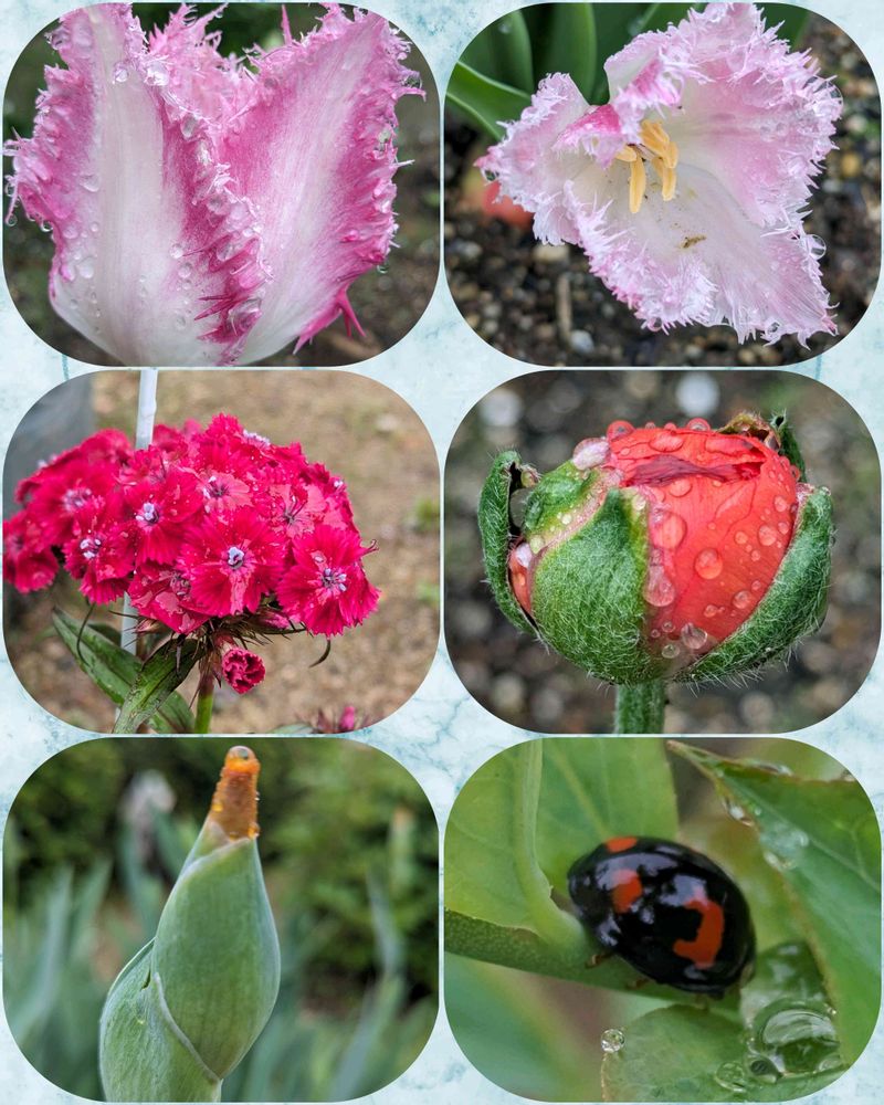 これが1球に2つ咲いた最後のチューリップと美女ナデシコ、花壇に1つだけ生えたラナンキュラス、そして、畑に植えているジャーマンアイリスの先っぽが覗いています🌿🥰 右下⬇テントウムシ🐞さん