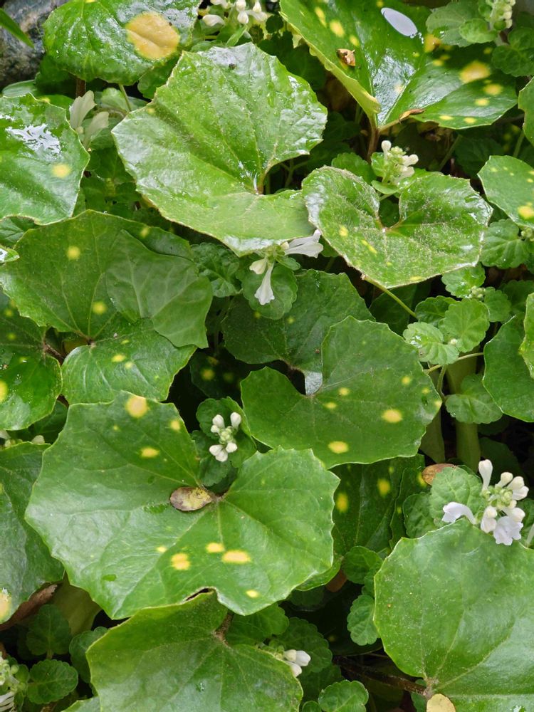 斑入りのツワブキの間から、いつの間にかタツナミソウの白が咲き出しました😳