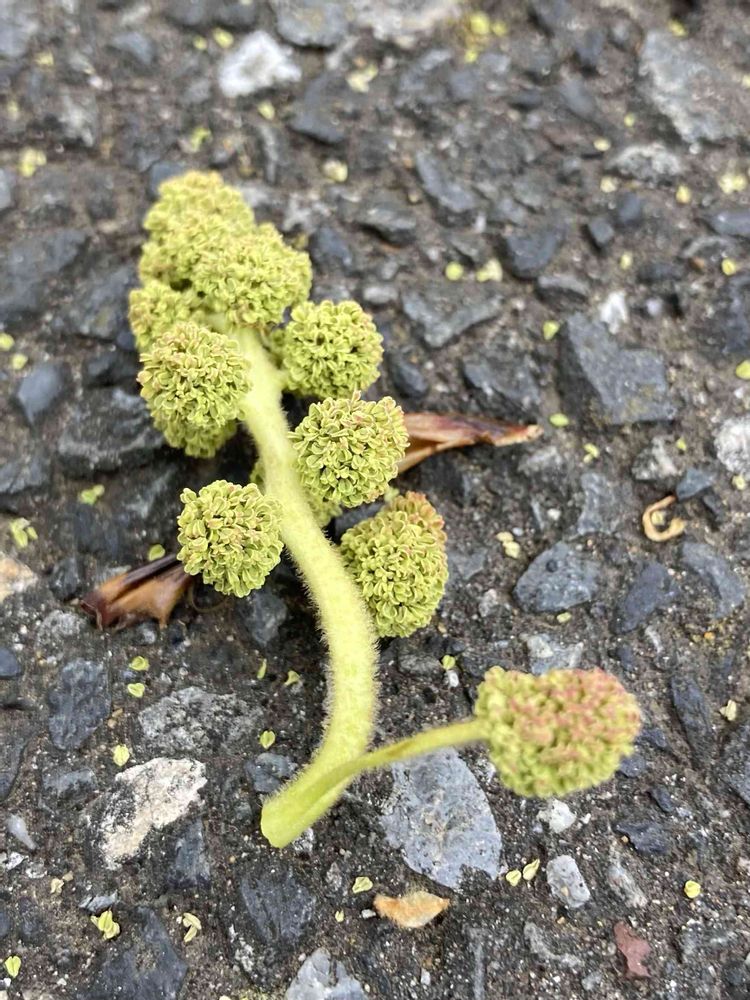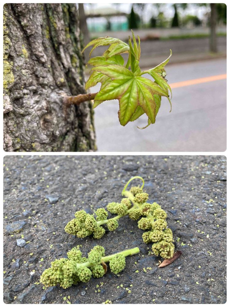 "あめりかふう通り".の並木を汚していたのは「アメリカフウ(モミジバフウ)」の花殻。 高い所で咲いていたので、落ちるまで気付かなかった。