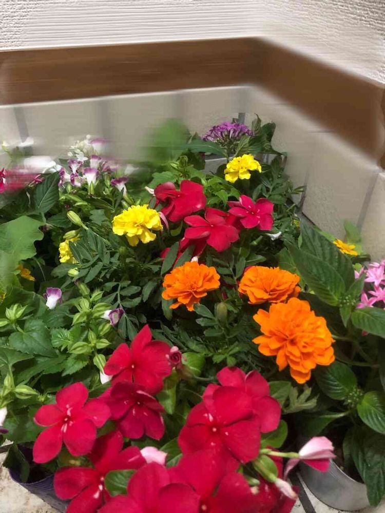 今日は、猛暑予報。これから植える花達は玄関の中で待機してます。