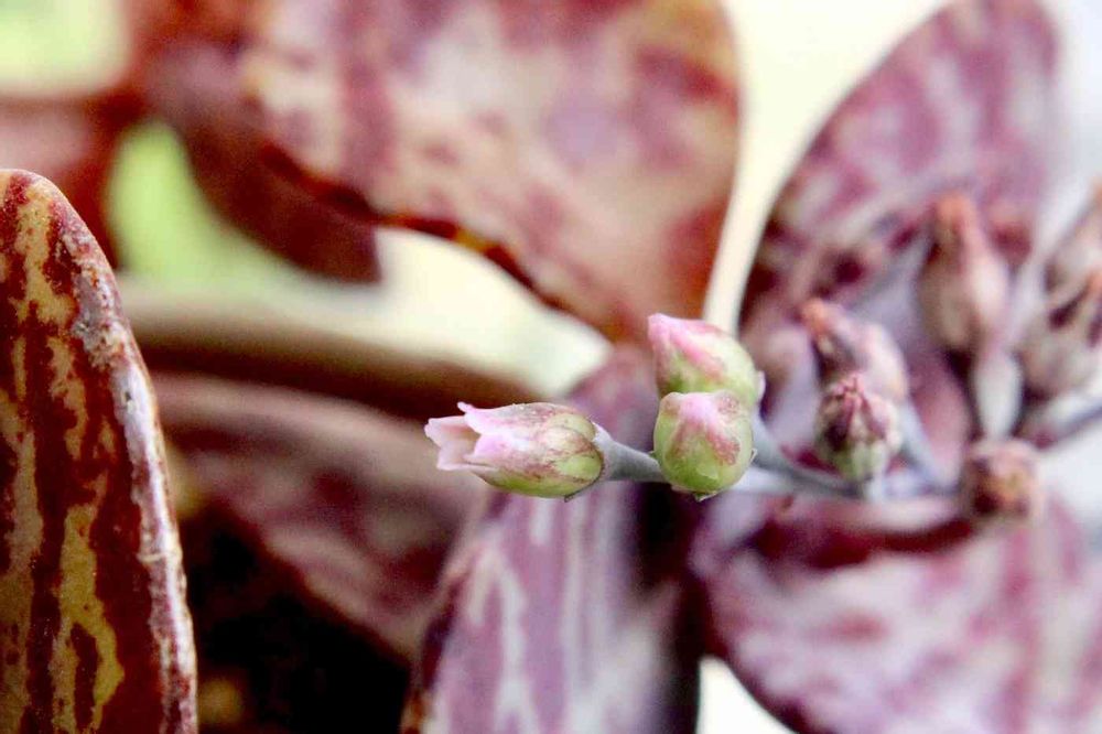 もしやこのおちょぼ口のような姿が開花なのか‼︎見れたから良しとしましょう😁ワイルドな柄の葉なのに花が地味〜