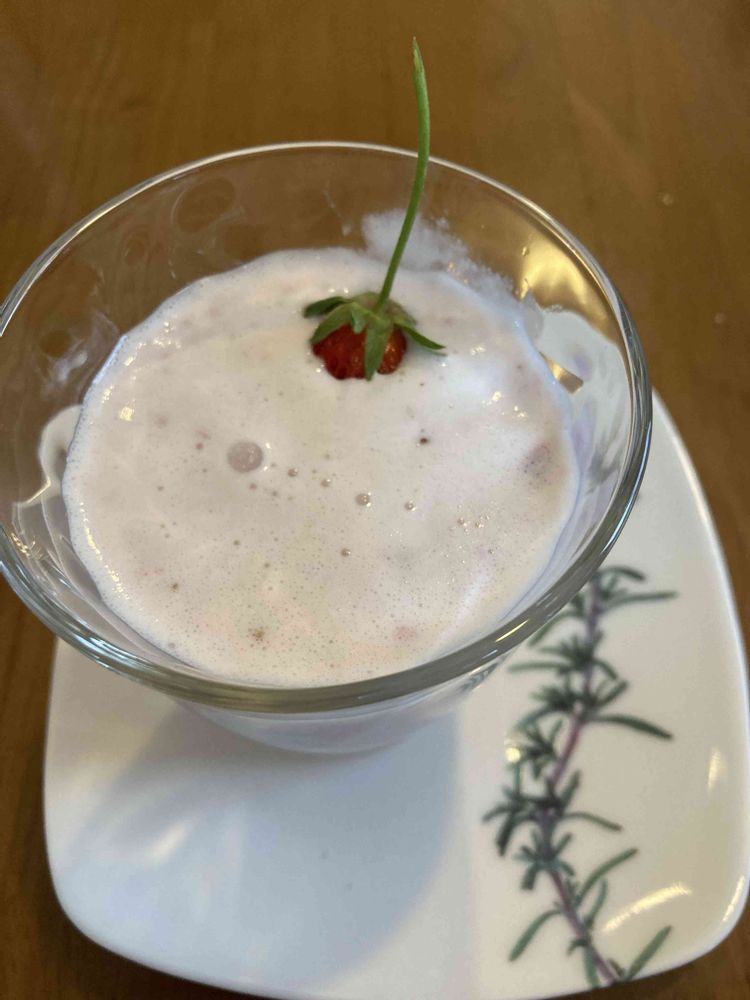 自家製甘酒、いちご、牛乳をミキサーでガーッ❗️少し泡立ってますね😅
