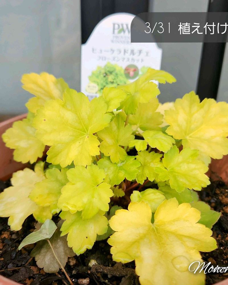 ⑤ヒューケラドルチェ フローズンマスカット…まだ黄緑です。葉の開き方がとてもキレイで満足😃✨
