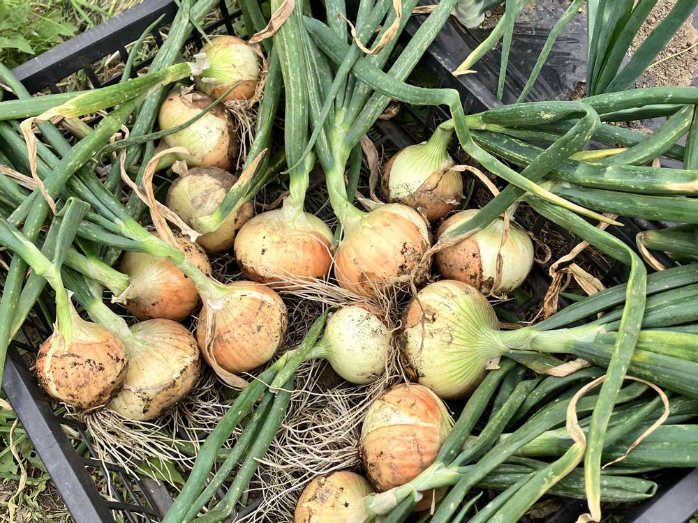 真ん中の極早生は、昨年はベト病だったみたいで皆、同じサイズばかりでしたが、今年は大きい物もあり、今、店頭で売っている🧅と同等のサイズに育ったものもあります