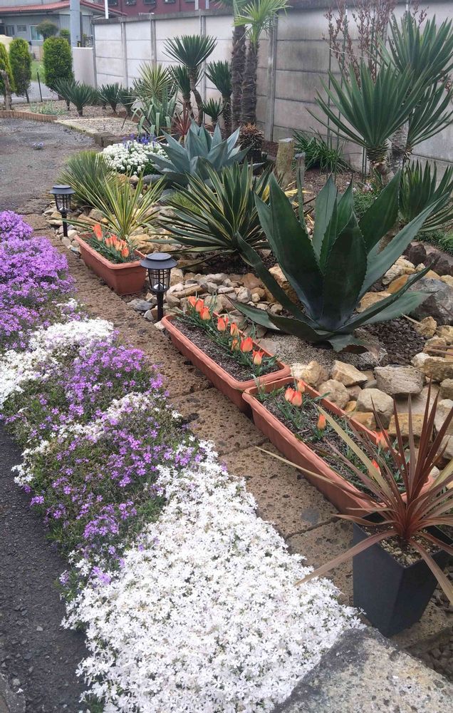 ドライガーデンと芝桜、チューリップ、その他のお花、意外と違和感ないですよ🤭