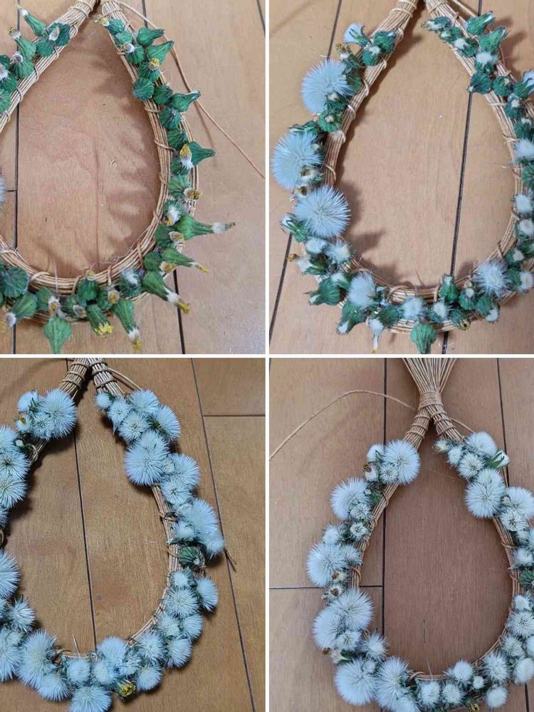 リースは摘んできて、直ぐにリース台にグルーガンでくっつけて放置です。綿毛の数は要るけど簡単です。