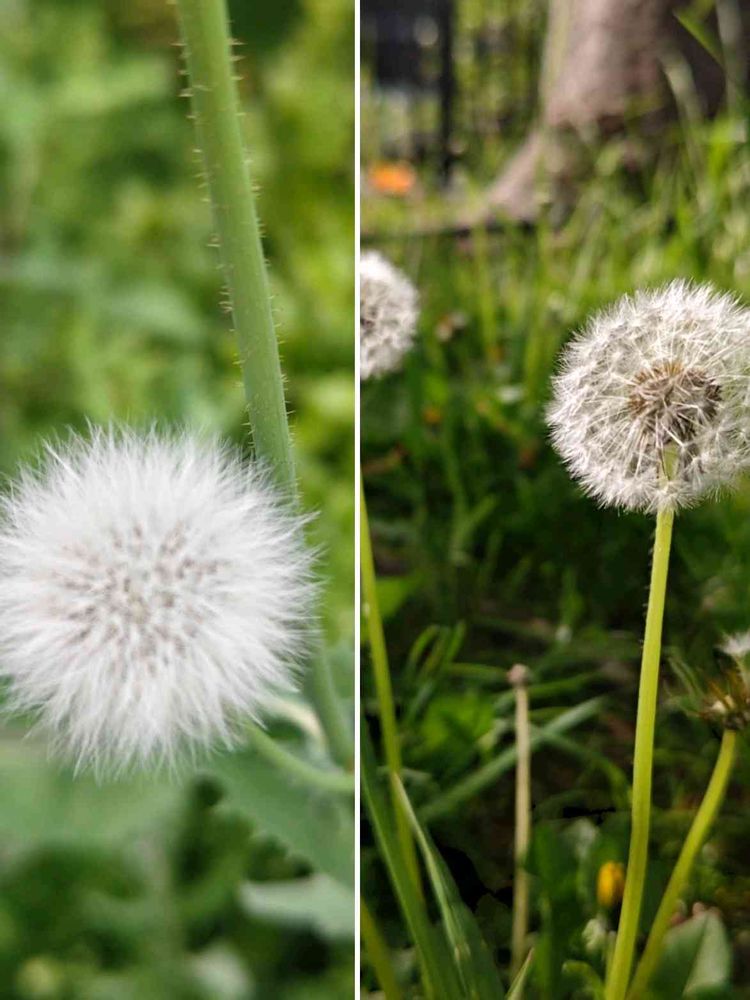 4枚め、ノゲシの綿毛とタンポポの綿毛。ノゲシの綿毛は小さくて密です。摘んできても、開くのに時間かかります。