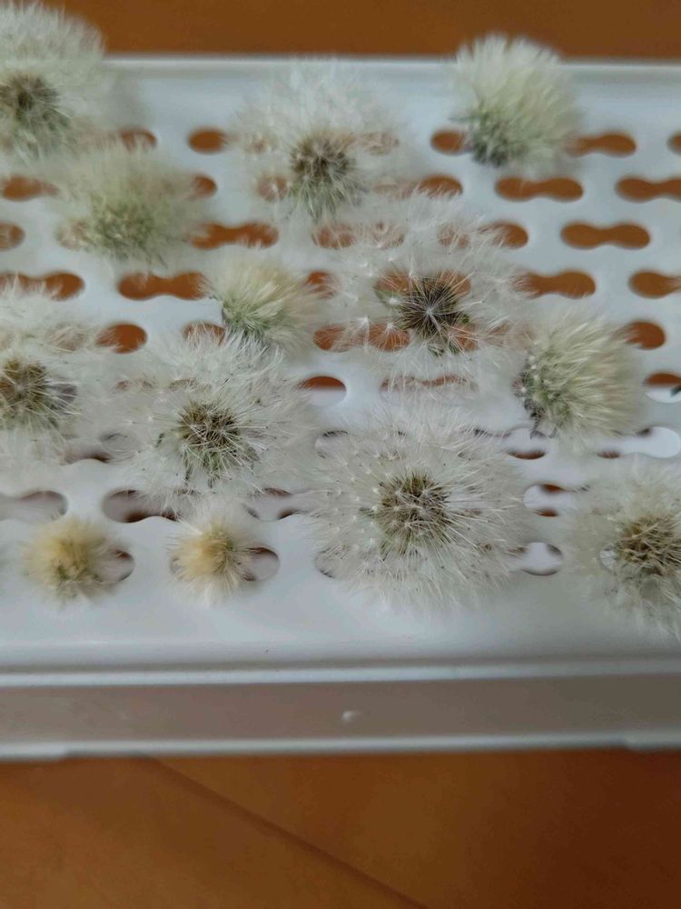 5枚め、茎も使う時は先に茎に細いワイヤー通して、私は下向けて吊り下げて干してます。頭だけ使う時は、こんな穴の開いた所に置いて、綿毛の開くのを待ってます。(ハーバリウムに入れると、何年もそのままフワフワで可愛いですよ💓)。