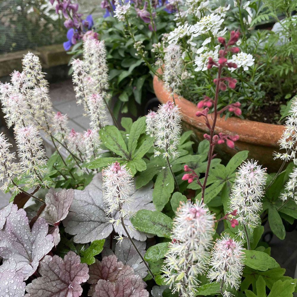 満開のティアレアの間に1本だけヒューケラ ドルチェ シルバーガムドロップの蕾が上がってきていました☺️