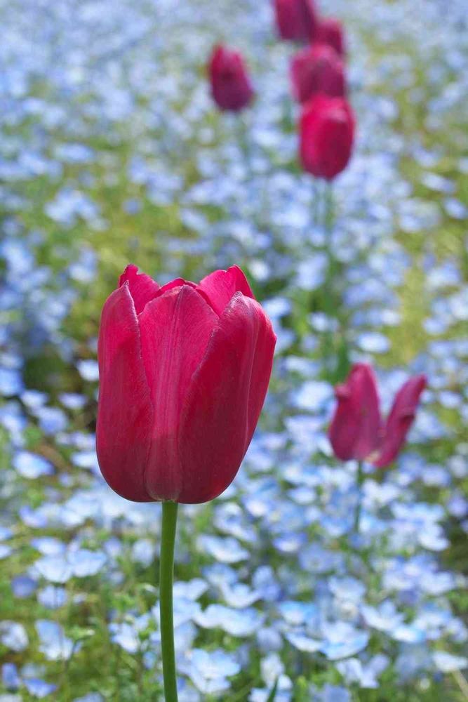2024/04/20、『鶴見緑地』で撮影した、ネモフィラの中の赤いチューリップ。