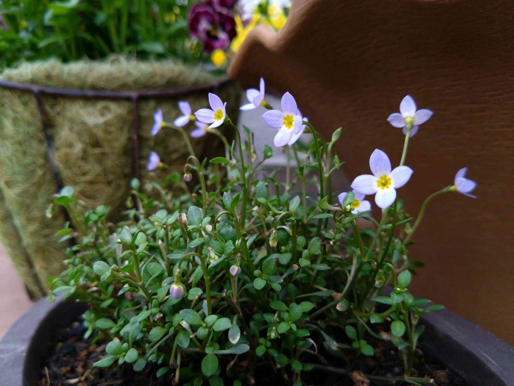 ❺冬越しで葉っぱがじくじくになり半分諦めていたヒナソウ、朝日のみのところに置いていたら復活してました🩵