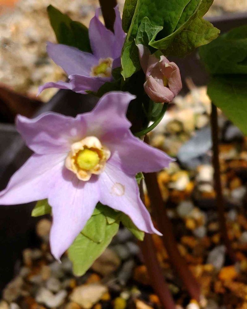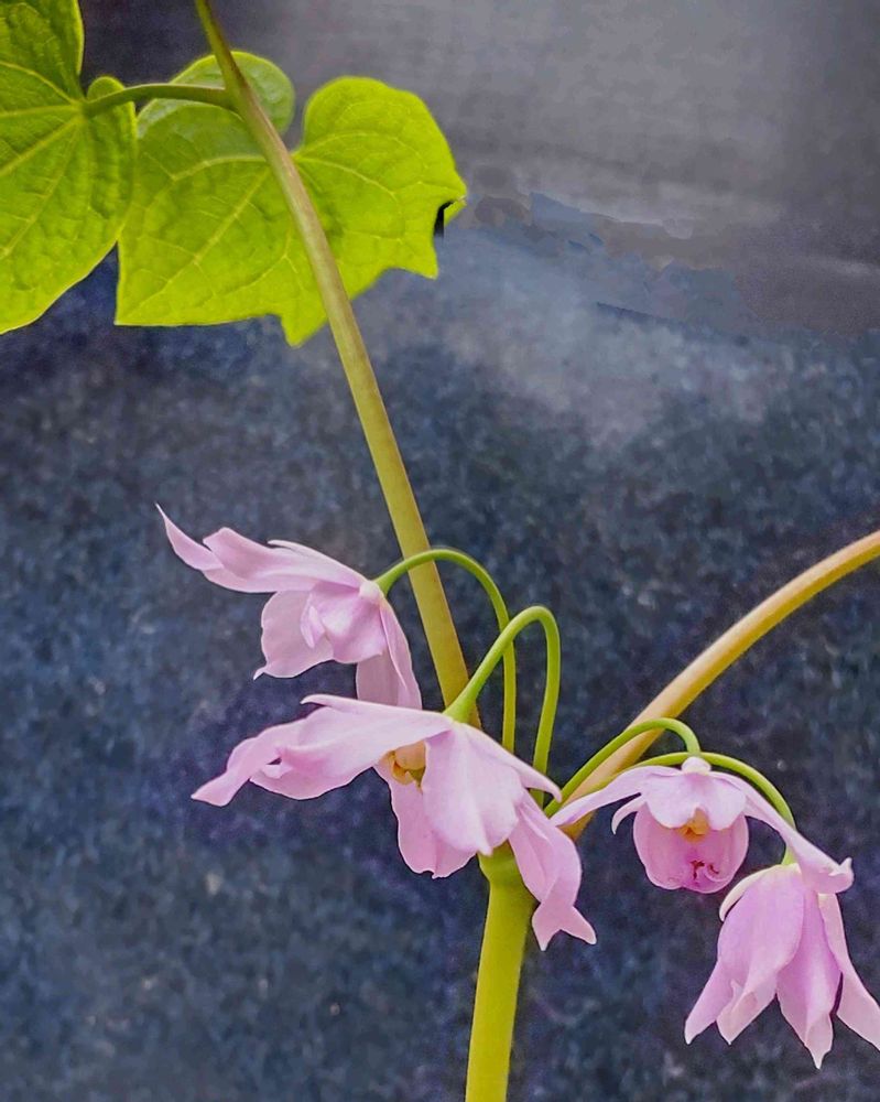 花径2~2.5㎝位の淡い赤紫色の花が下向きにつき咲きます。