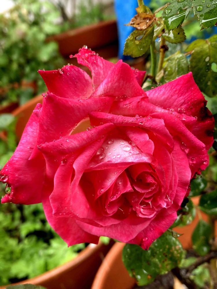 こんばんは🌇久しぶりの投稿です💦雨ばかりの数日でした☔️庭の薔薇🌹が赤く一輪咲いていました😊姿は少し乱れてますがひどい雨風に耐えて健気な子です😅