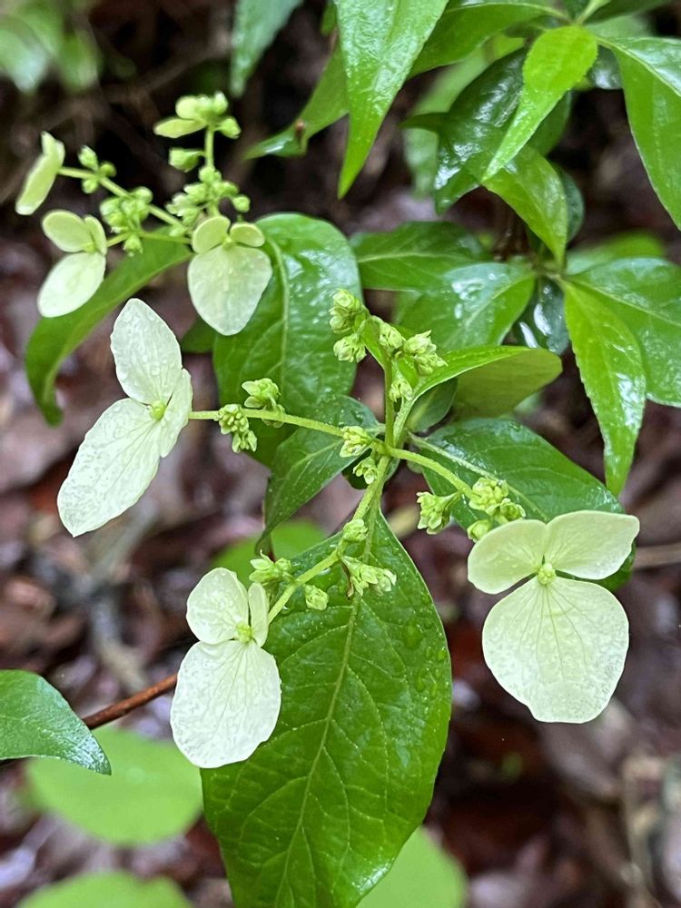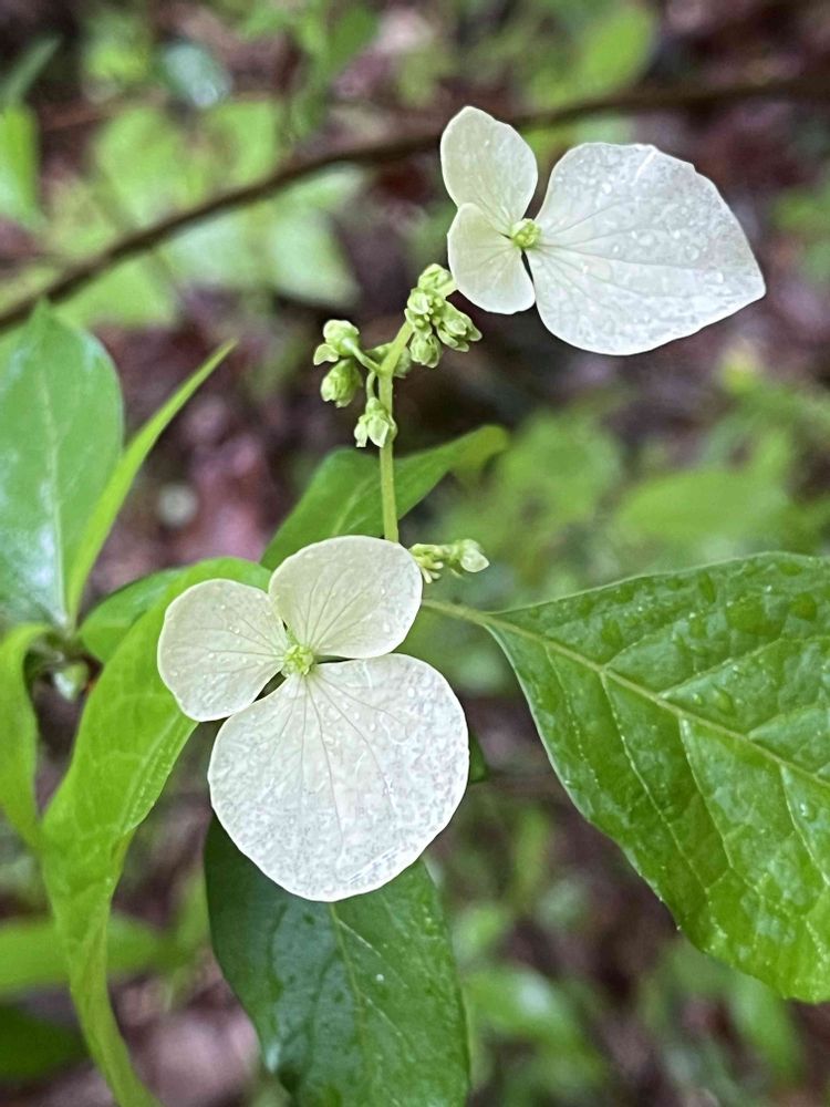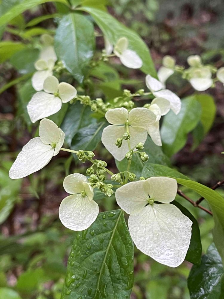 小雨降る林内で装飾花が輝いて見えました🌼