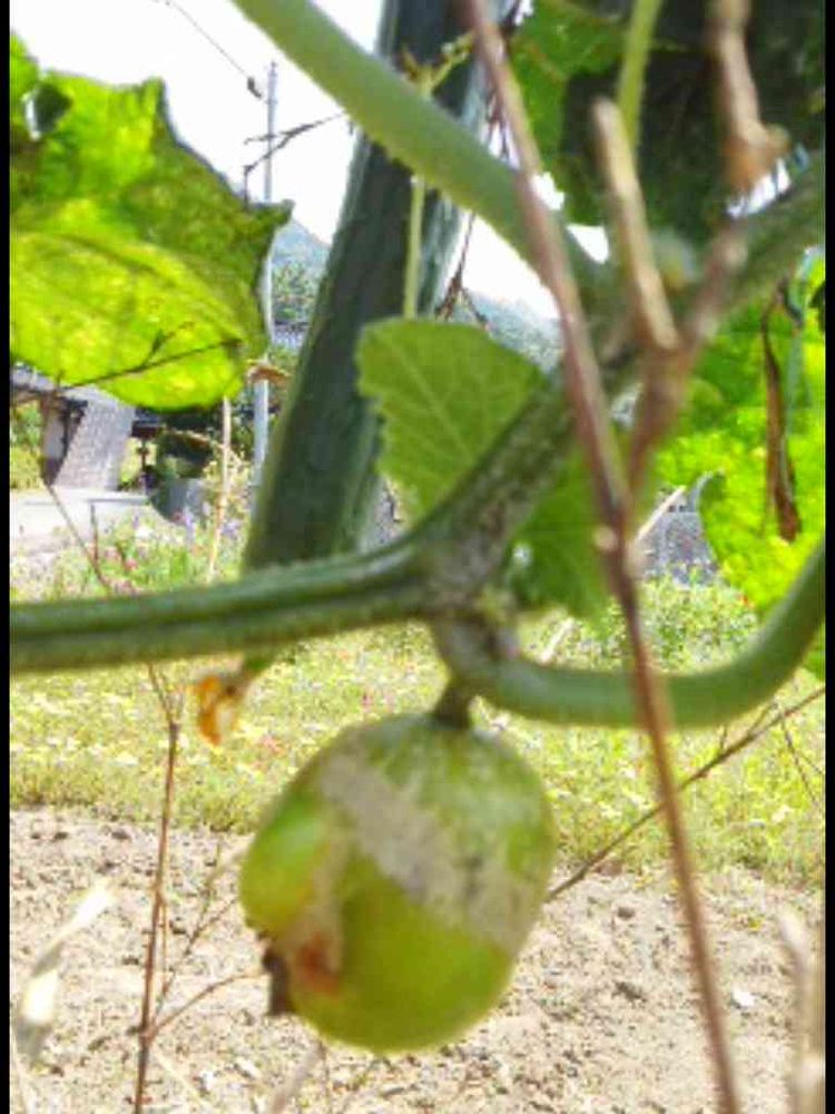 友人宅の畑。キュウリ🥒のつるに、何かトマト🍅のような物がある。🤔何個かあります。