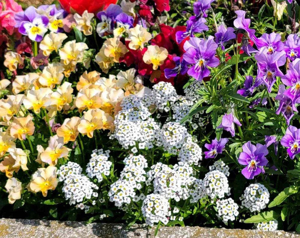 ①②こぼれ種からのスイートアリッサム✨秋にビオラたちを植え付けた後に芽🌱を出し成長しました✨