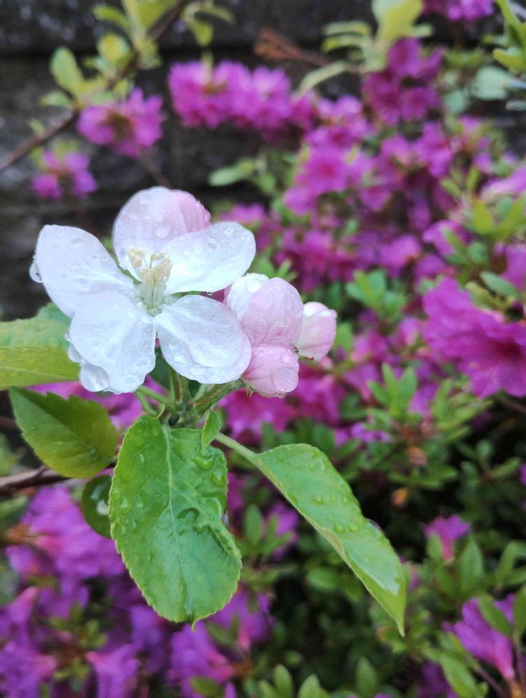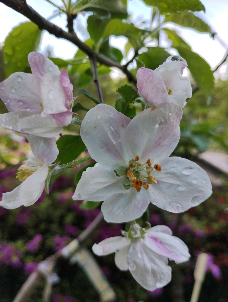 りんごのお花❣️ぐんま名月とつがる姫です。3枚目はクレマチス ムーンビーム。他の草花に追いやられて小さくなって咲いてました😅草引きしなくては💦