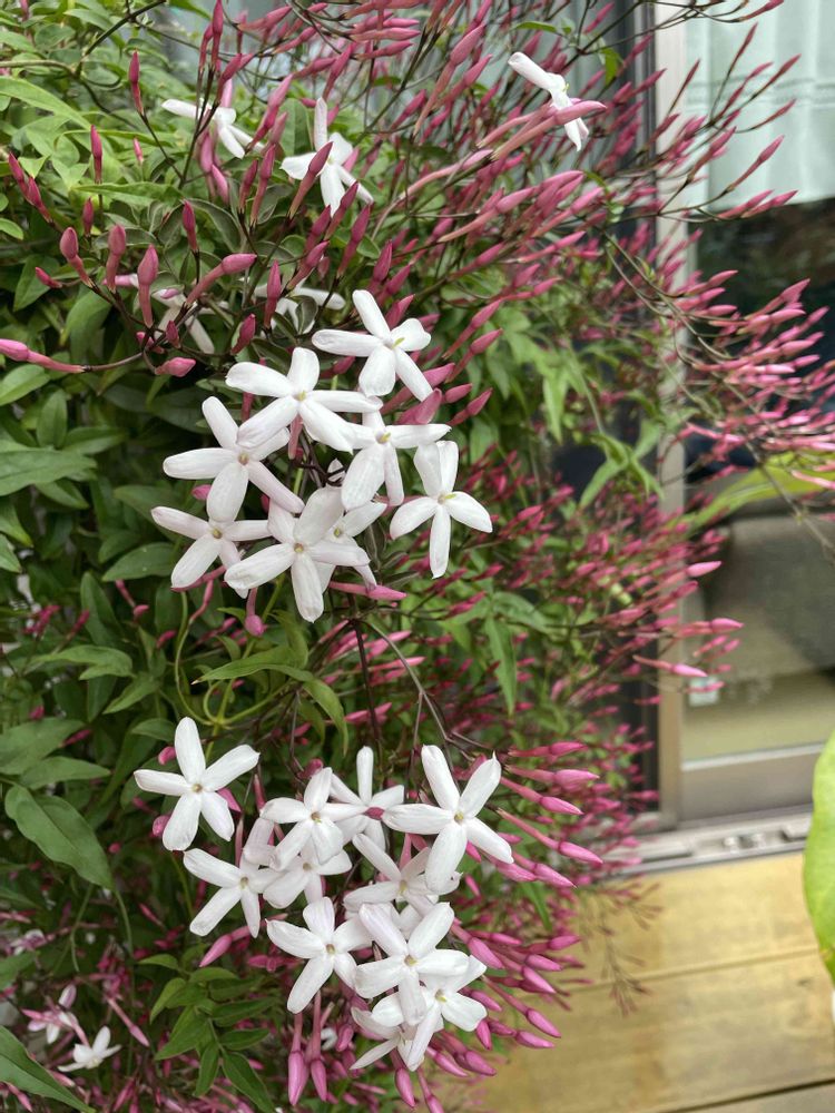 ハゴロモジャスミンの真っ赤な蕾に白い花が美しいです❤️❤️❤️🤍🤍🤍