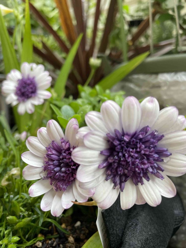 オステオスペルマム、白に紫のシベ、私は2度も1年で枯らしました。好きなタイプです。🤍🤍🤍💜🤍🤍🤍💜