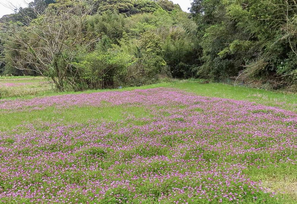 田んぼに水を張る前のいっとき、蓮華に覆われてピンク色の絨毯が見られます😍