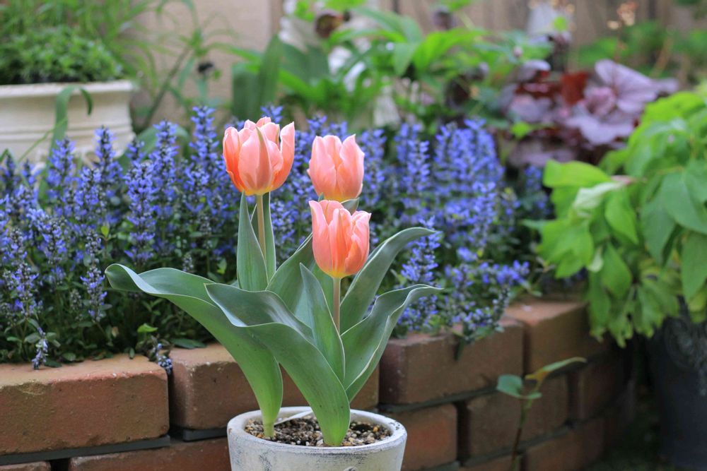 バックのアジュガが可愛いチューリップ🌷を