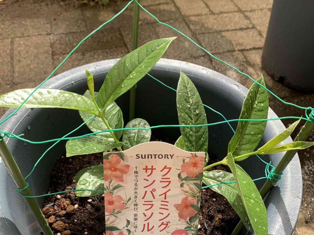 クライミングサンパラソルは支柱を立てて、強制的に誘引しました🤣