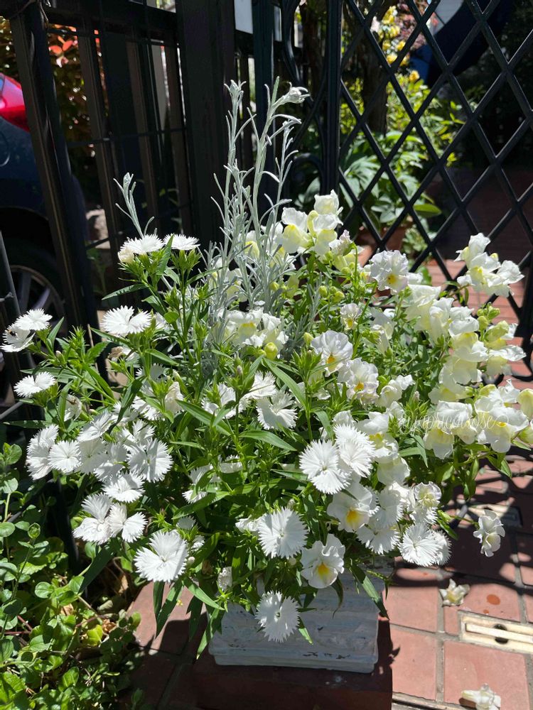秋に作った白い寄せ植えは冬の間もポツポツ咲いていましたが、暖かくなってモーリモリ😆