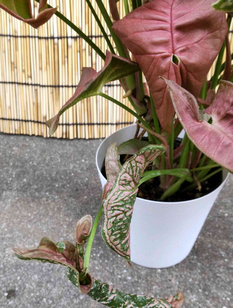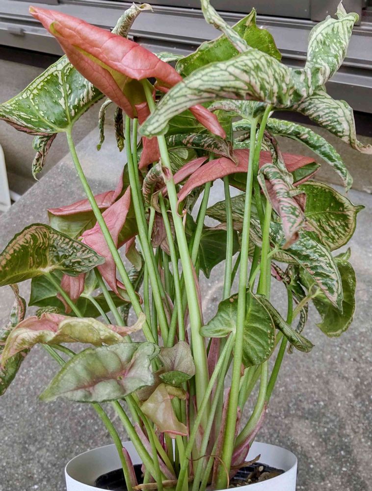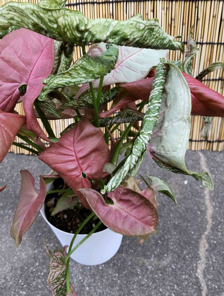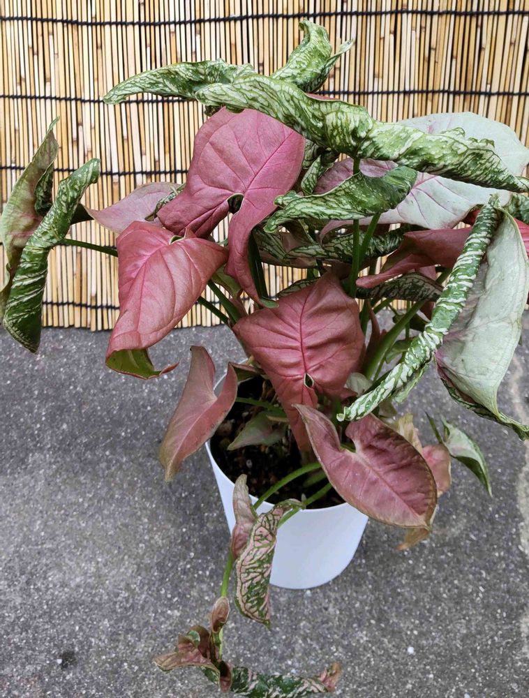 こんにちわ😃これね3株位植わってて下の古い葉っぱがクルンとなって最近出た葉っぱが赤いみたい。季節によって葉っぱの形状が変わるとか?シンゴニウムピンクローリーってレアで高いのに似てるけどまさかね😅