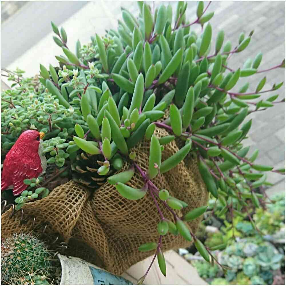 麻布でくるんだプラかごに垂れ系の多肉を〜確か…ハートカズラもあったはずなのに消えちゃったのか見えない〜💦
