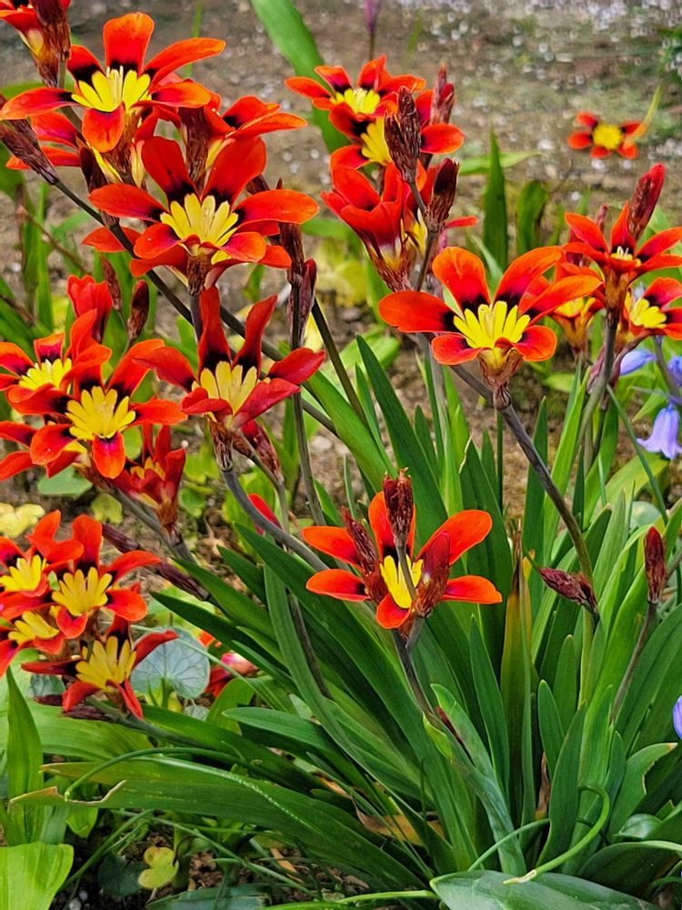 この花はスパラキシスと言って、球根植物だから特別なことをしなくても毎年植えっぱなしで時期が来れば咲きますよ。😉