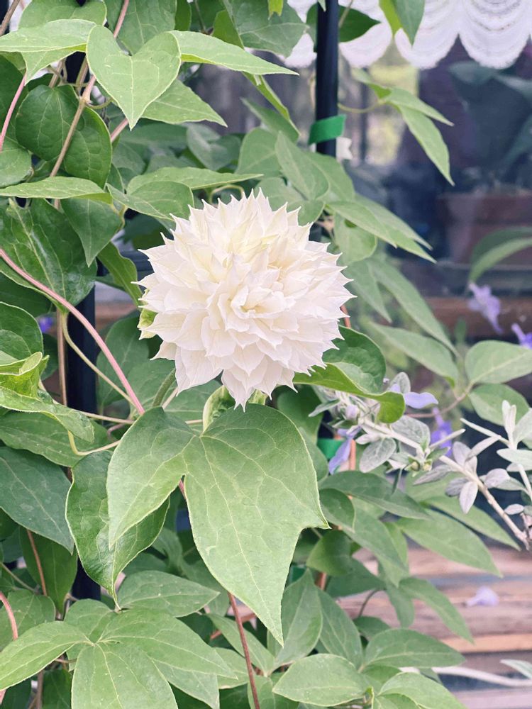 クレマチス ダッチェス・オブ・エジンバラ 近所の自転車修理店は、お花がいつもたくさん咲いてて、このクレマチスがとっても可愛いので、写真撮らせてもらいました💕