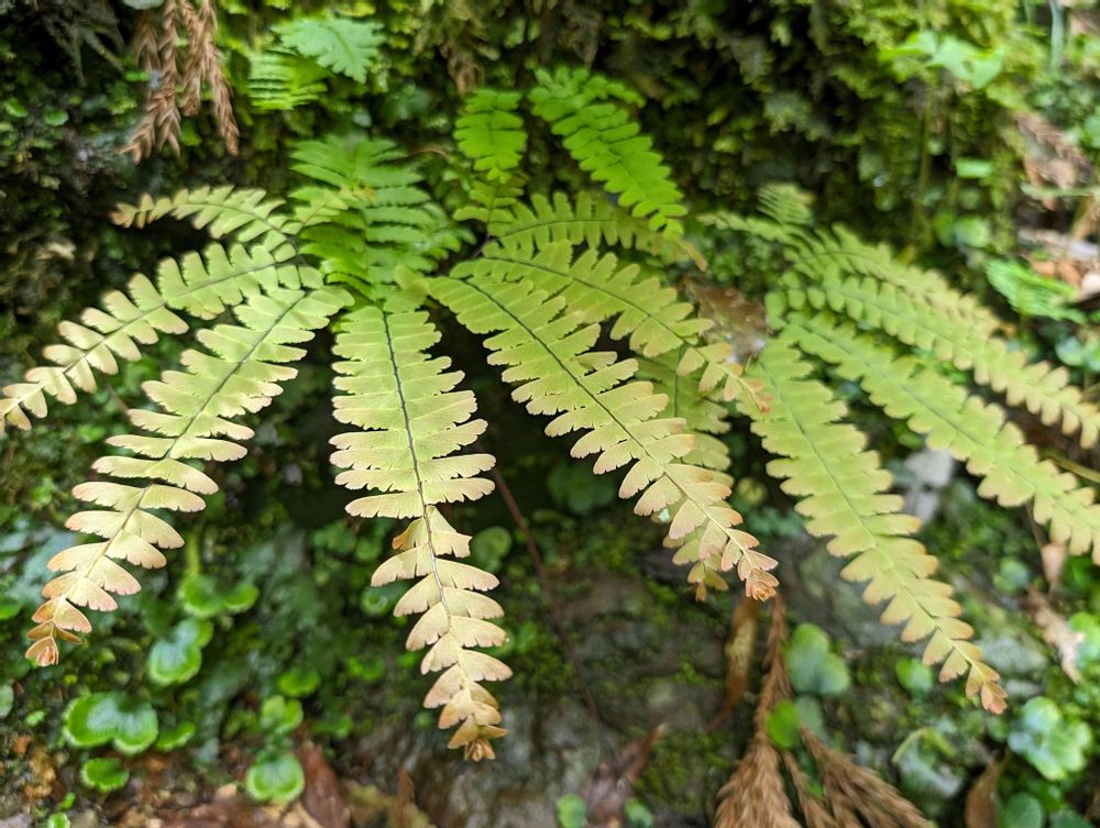 春山花散策、緑濃くなった深山渓谷を散策しました。北向き斜面の崖にほんのりまだ紅の残るアジアンタムが葉を広げてました。2024.4.26 本巣市