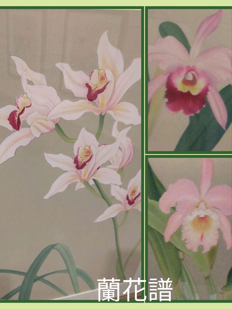 ③展示された花図絵 左シンピジューム・ジャイアントローズ・オオヤマザキ
