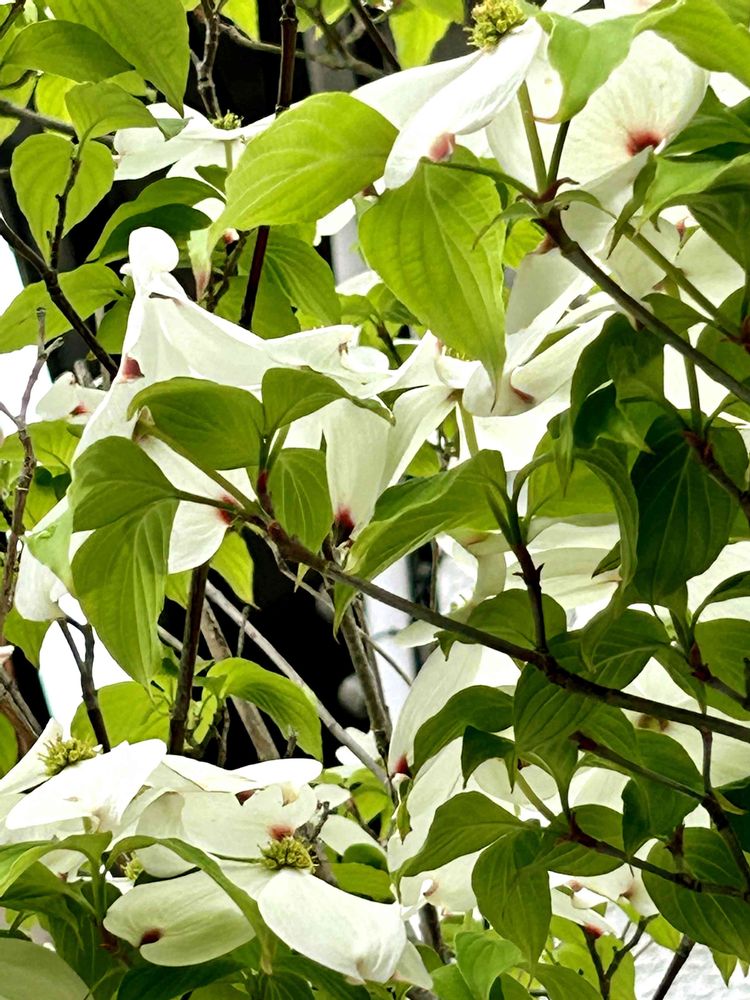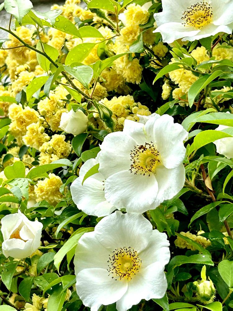 ご近所さんのモッコウバラとナニワノイバラの競演が素敵でした🤗2枚目はお向かいさんのハナミズキも満開です🌿💛🌿🤍🌿
