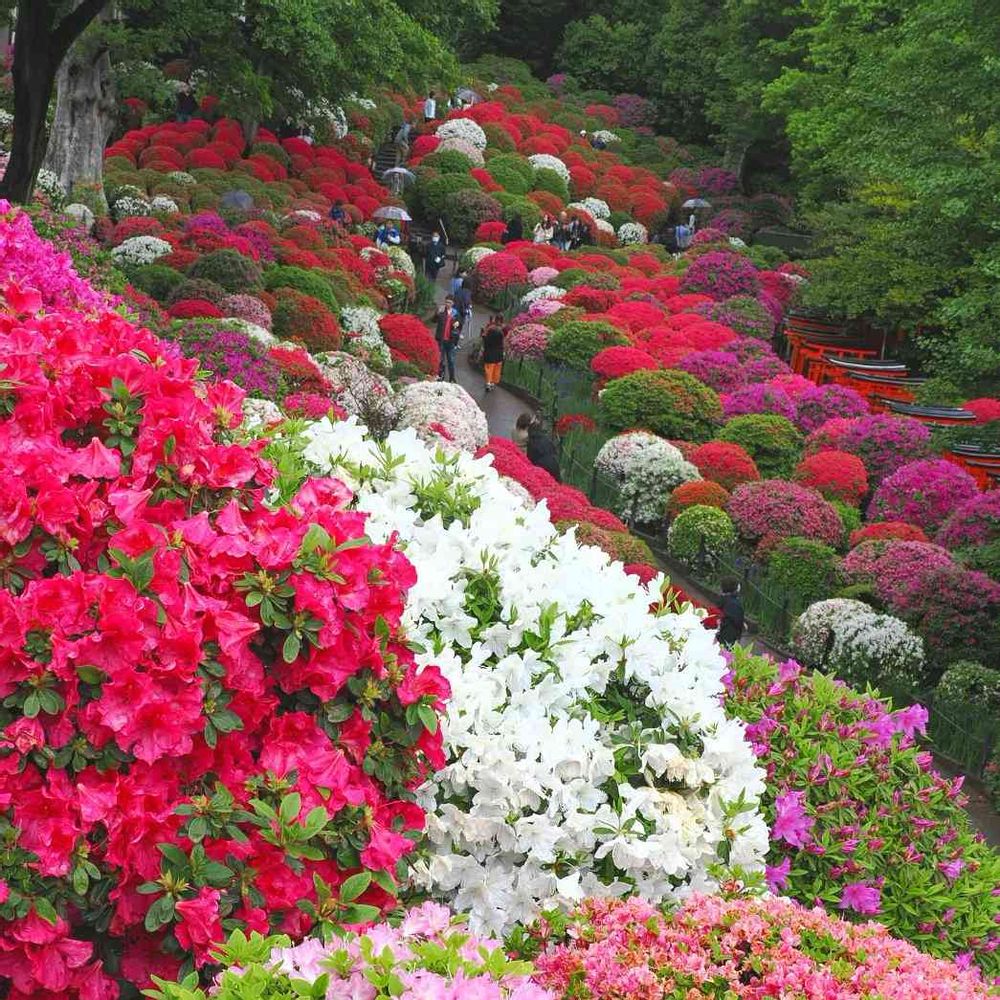 色とりどりの傘と色とりどりのツツジ