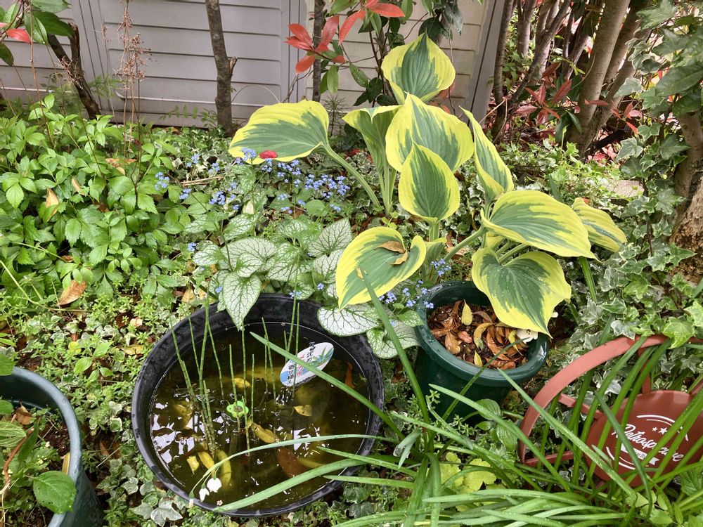 【朗報】 金木犀の下の偽シェードガーデンのホスタとブルンネラが大きくなってきました。今年はこの日陰のところにメダカの鉢と去年一昨年と失敗したブルーポピーの鉢を置いている…