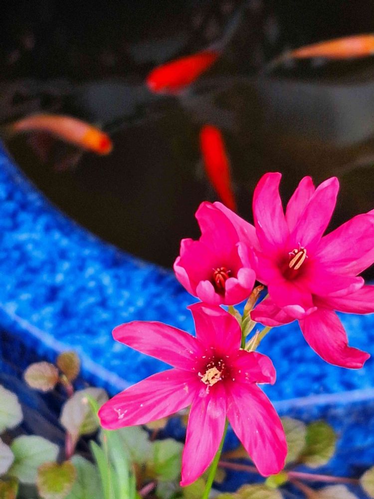 睡蓮鉢の🔵ブルーが金トトとお花を引き立ててくれたよ🔴