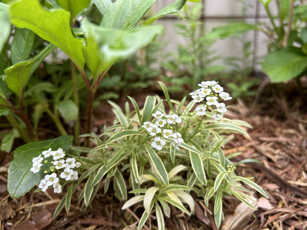 ①一昨年秋に植栽した、葉っぱの縁取りが特徴的なアリッサム