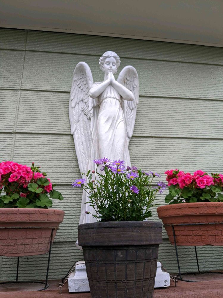 @ゆきゆき さまへ こんばんは🌠🌠🌠 見てくださりありがとうございます🤗 高さは87cmです。確かに、本で調べたことがあり、性別はないと書いてありましたね。スペイン語などでは、最後のスペルがaのものは、女性名詞と習いました。イタリア語も同じですね。それで、アンジェラは女性名詞だけど、エンジェルはどうなるのか、と考えたとき、天使といえば、どちらもあるのかもと思い、天使という言葉に改めたのです。 それから、このオブジェは、Made in China でした。だから、手が仏教のように手を合わせています。合掌なのです。多分、中国で作られるとき、手を組むのでなく、仏教的に合掌にしたのではないか、と推察しています。販売されていたときは、名札に「祈りのエンジェル」と書かれていましたので、キリスト教の天使には間違いないのでしょうが、合掌を見たときに、驚きましたが、仏教徒ですから、とても気に入りました。仏教では羽付き天使はいらっしゃいません。