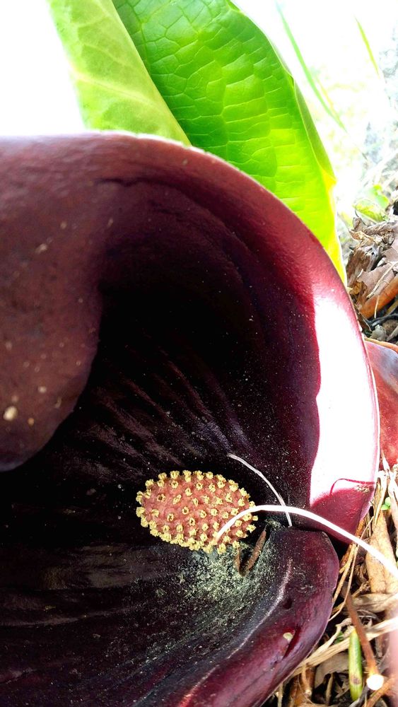 二枚目 ザゼンソウ2の花序(白くて丸い部分)花粉がこぼれている