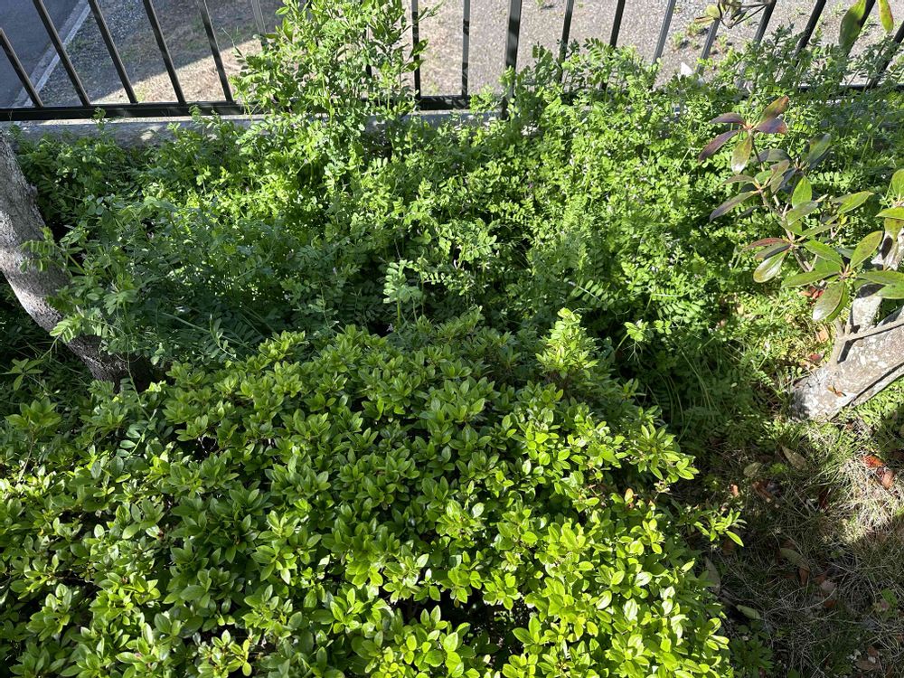 ツツジの向こうのカラスノエンドウ、今日こそは、と雑草取り。①ビフォア②アフター